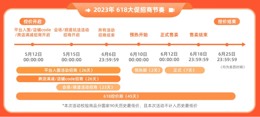 AliExpress 618招商从5月中旬开始,持续到6月6日。6月10日启动预热,为期2天;6月12日开始为期7天的正式售卖期,至6月18日结束。控价从5月12日开始至6月25日结束,共45天。注意均为美西时间。